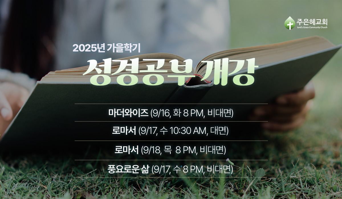 예배 - 예배의 중심은 하나님입니다. 하나님이 기뻐하시고 찾으시는 예배자 되기를 바랍니다. 2025 비전 - 주은혜 새해 비전은 “모든 일을 사랑으로” 입니다 (고전 16:14)생명의 삶/ 강해설교 - 생명의 삶/QT 일정에 따라 말씀을 전하고 받습니다. 주일 예배를 위해 기도 바랍니다. 말씀의 은혜를 간구 바랍니다. 우크라이나 선교 - 오늘은 우크라이나 김교역 선교사님이 선교보고와 함께 말씀 전합니다. 선교지를 위해서 계속해서 함께 기도 바랍니다. 가을학기 성경공부 - 2025년 가을학기 말씀훈련을 위해 기도 바랍니다. 주은혜가 말씀과 기도로 예수님의 참된 제자들로 견고하게 세워지기 간구 바랍니다. 친교는 즐겁다! - 모르는 성도들이 없도록 교제에 힘써 주시기 바랍니다. 주일 친교는 친교팀의 지침에 따라 앉아 친교해주시기 바랍니다. 감사찬양제 - 하나님께 감사찬양으로 영광 드리기 원합니다 (순별). 일시: 11월 30일 (주일 오후 2시) 생명의 삶 10월호 (로마서 12-16장, 스가랴) - 매일 생명의 삶 말씀 큐티로 하루를 시작하기 원합니다. 교회가 함께 말씀을 받고 함께 은혜를 나누기를 원합니다. 새해에는 토요새벽기도회와 주일설교도 생명의 삶 말씀으로 받습니다. 구입 및 문의: 이선영 권사. 창립 9주년 기념주일 - 주은혜 창립 9주년 기념 주일입니다 (10월 12일). 이웃과 가족들을 초청하여 하나님께 감사와 영광 드리기 원합니다. 가정 예배 - 자녀들과 함께 찬양하고 기도하는 은혜를 간구합니다. 매일 받은 은혜를 가족들과 나누는 시간을 갖기 바랍니다. 주기도문과 사도신경으로 함께 기도하기를 원합니다. 교회와 선교지를 위하여 함께 기도 바랍니다. 토요새벽기도회 - 매주 토요일 새벽기도회가 오전 6시에 본당에서 있습니다. 이번주 말씀: 생명의 삶 QT (10월 4일). 찬송 452장. 중보기도 집중 주간 - 이번주는 파라과이 이희수 선교사님을 위해서 기도 바랍니다. 빈민촌 선교와 신학교 선교위에 성령의 기름 부으심을 위해서. 교회 지도자들이 신학훈련을 틍해 말씀으로 세워질 수 있도록. 선교사님의 영육간의 성령 충만함과 강건함의 위해 기도 바랍니다. 전교인 성경필사 - 2025년에도 전교인 성경필사의 은혜를 간구합니다. 매일 하루에 한 절 이상합니다. 자녀들까지 모두 동참합니다. 필사노트가 필요하신 분들은 신청 바랍니다. 330 기도 – 하루에 세 번 30초/3분/30분 이상 교회와 선교지와 미국를 위해 기도 바랍니다. 매일 330 기도시 자녀들의 영적 전쟁, 진리 분별, 예수님의 제자로서 빛과 소금의 삶을 살아갈 수 있도록 기도 바랍니다. 그린 타임 캠페인 - 스크린 타임을 줄이고 Green time을 늘리는 캠페인에 동참 바랍니다. 각 가정에서 부모님들이 먼저 스크린 타임을 줄이고 자녀들과 함께 밖에서 교제하는 시간을 늘려 주시기 바랍니다. 바이블 타임의 지혜 또한 간구 바랍니다.